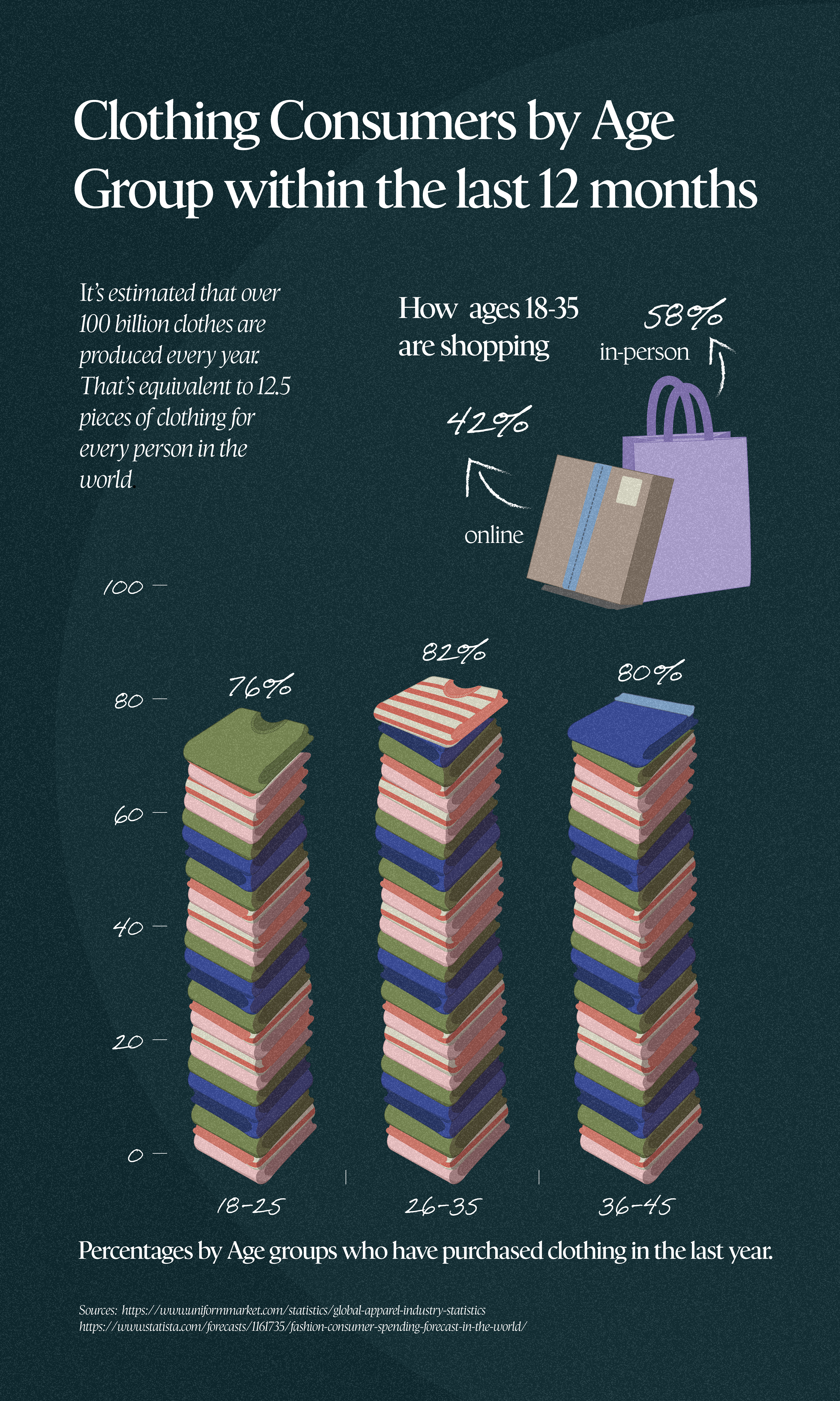 This illustrated infographic highlights the age groups who consume the most clothing per year and how many have shopped for clothing within the last year via the bar chart of folded clothing stacked onto of each out. The pie chart is disguised as the box and shopping bag, indicating the percentage of how shoppers prefer to get their clothes (online and in-store).