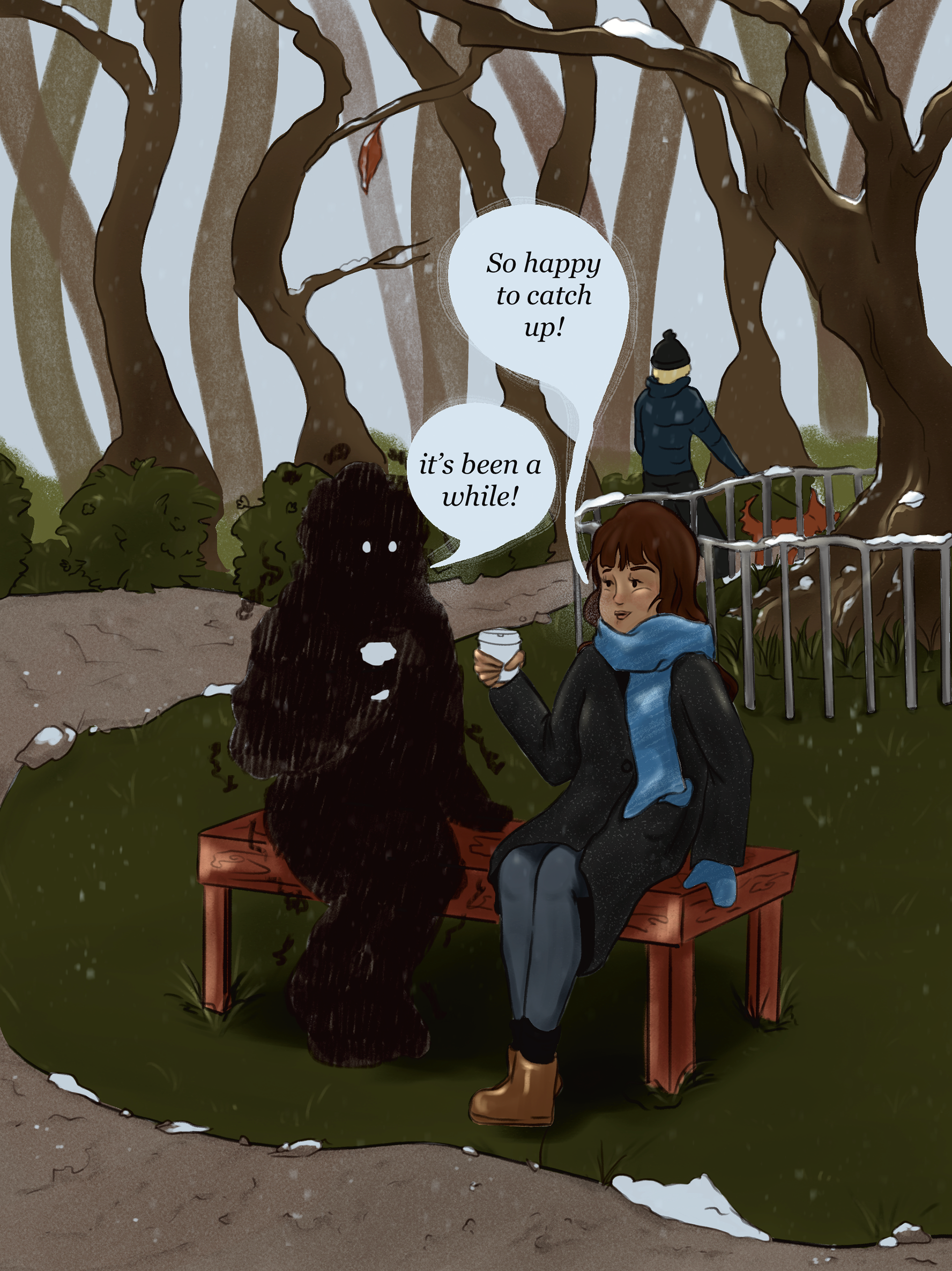 Ironic literal interpretive response project to the phrase "Hello darkness my old friend". This illustration was created as an upbeat and silly interpretation of the phrase, mean to in still viewers with a more literal visual meaning.